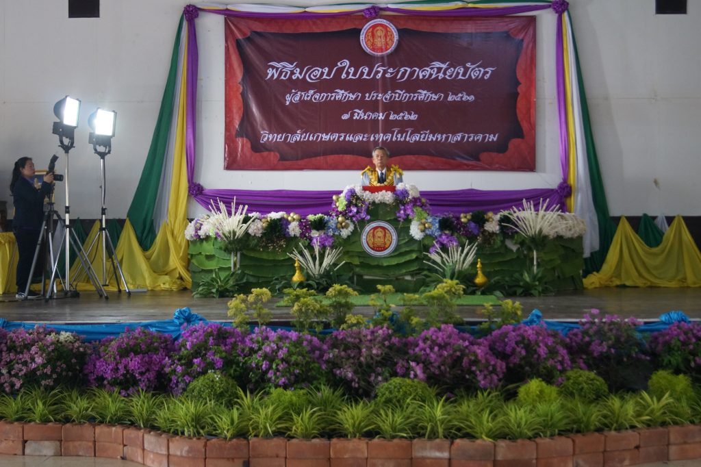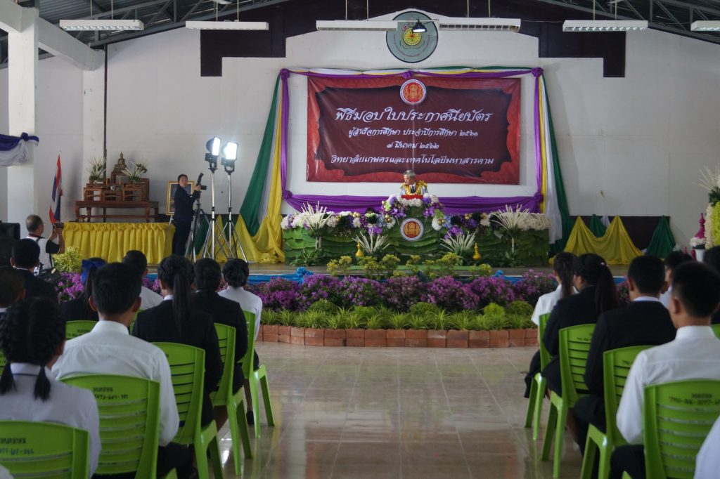 วันที่ 7 มีนาคม 2562 นายดุสิต สะดวก ผู้อำนวยการวิทยาลัยอาชีวศึกษามหาสารคาม เป็นประธานในพิธีมอบประกาศนียบัตรพร้อมให้โอวาทแก่นักเรียน นักศึกษา ที่สำเร็จการศึกษา ประจำปีการศึกษา 2561 ในระดับ ปวช. และ ปวส. โดยมีคณะผู้บริหาร ครู บุคลากร  และผู้ปกครอง ร่วมแสดงความยินดี  ณ หอประชุมพระพิรุณ วิทยาลัยเกษตรและเทคโนโลยีมหาสารคาม